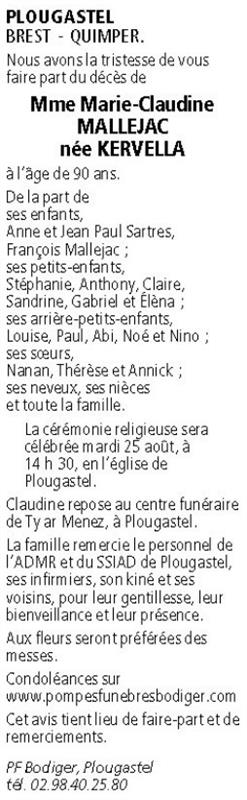 Madame Marie-Claudine MALLEJAC née KERVELLA