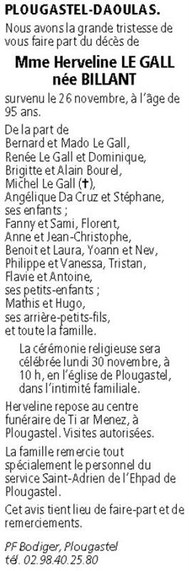 Décédée à Plougastel-Daoulas (29470, France) le jeudi 26 novembre 2020 à l'âge de 95 ans