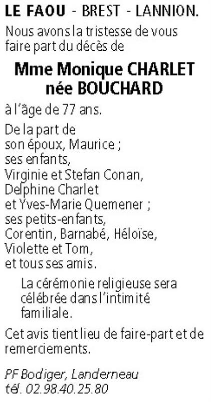 Décédée à Landerneau (29800, France) le jeudi 26 novembre 2020 à l'âge de 79 ans