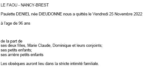 Décédée à Le Faou (29590, France) le vendredi 25 novembre 2022 à l'âge de 96 ans
