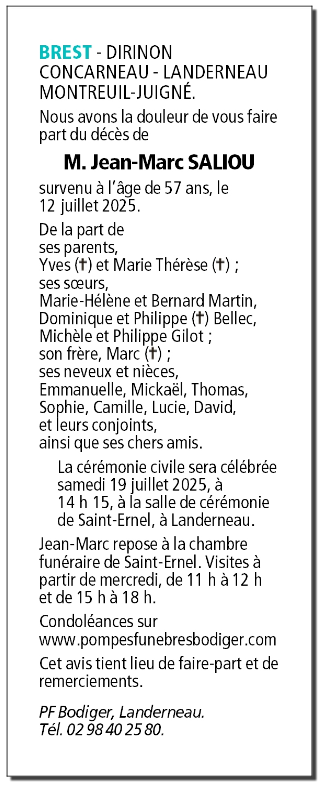 Décédé à Brest (29200, France) le samedi 12 juillet 2025 à l'âge de 57 ans