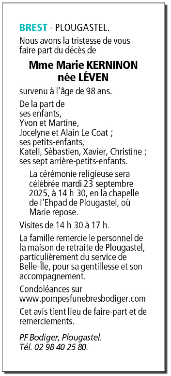 Décédée à Plougastel-Daoulas (29470, France) le jeudi 18 septembre 2025 à l'âge de 98 ans