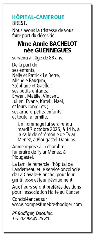 Décédée à Landerneau (29800, France) le mercredi 1 octobre 2025 à l'âge de 88 ans