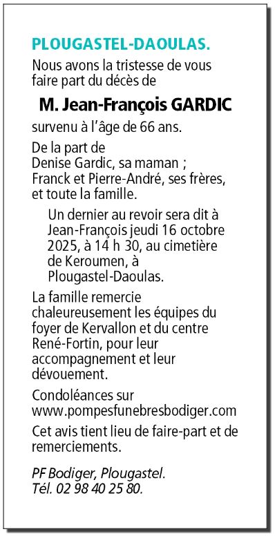 Décédé à Bohars (29820, France) le lundi 13 octobre 2025 à l'âge de 66 ans