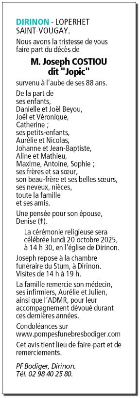 Né à Dirinon (29460, France) le dimanche 28 novembre 1937