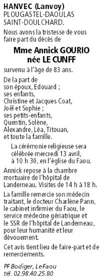 Décédée à Landerneau (29800, France) le vendredi 8 avril 2022 à l'âge de 83 ans