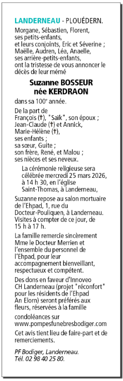 Décédée à Landerneau (29800, France) le jeudi 19 mars 2026 à l'âge de 99 ans