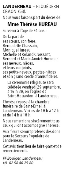 Décédée à Landerneau (29800, France) le lundi 25 septembre 2023 à l'âge de 84 ans