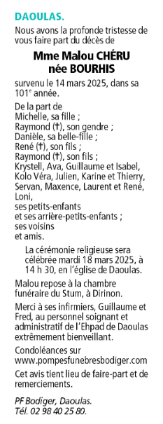 Décédée à Daoulas (29460, France) le vendredi 14 mars 2025 à l'âge de 100 ans