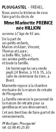 Décédée à Plougastel-Daoulas (29470, France) le lundi 21 février 2022 à l'âge de 93 ans