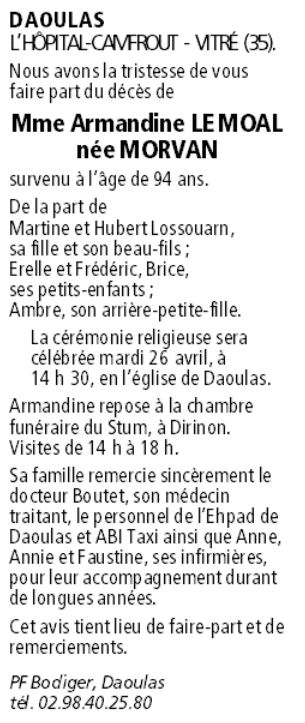 Décédée à Daoulas (29460, France) le samedi 23 avril 2022 à l'âge de 94 ans
