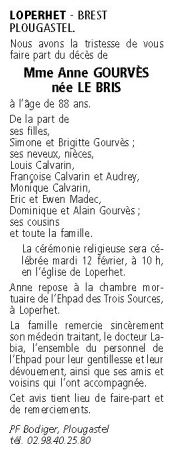 Décédée à Loperhet (29470, France) le samedi 9 février 2019 à l'âge de 88 ans