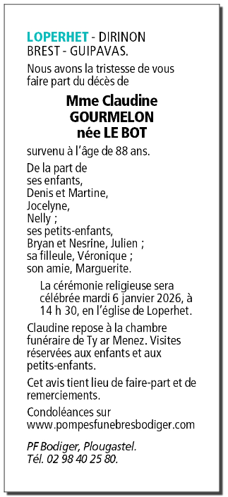 Décédée à Bohars (29820, France) le vendredi 2 janvier 2026 à l'âge de 88 ans
