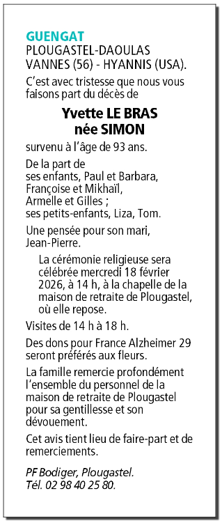 Décédée à Plougastel-Daoulas (29470, France) le samedi 14 février 2026 à l'âge de 93 ans