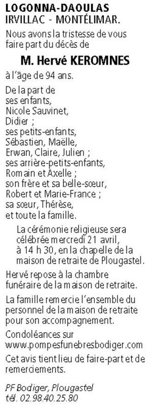 Décédé à Plougastel-Daoulas (29470, France) le samedi 17 avril 2021 à l'âge de 94 ans