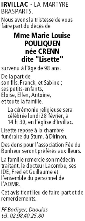 Décédée à Irvillac (29460, France) le jeudi 24 février 2022 à l'âge de 98 ans