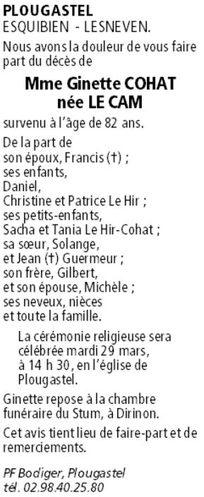 Décédée à Plougastel-Daoulas (29470, France) le vendredi 25 mars 2022 à l'âge de 82 ans