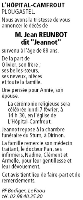 Décédé à L'Hopital Camfrout (29460, France) le jeudi 3 février 2022 à l'âge de 88 ans