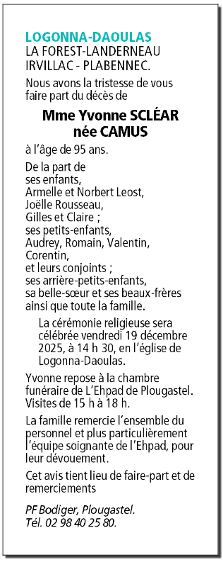 Décédée à Plougastel-Daoulas (29470, France) le lundi 15 décembre 2025 à l'âge de 95 ans
