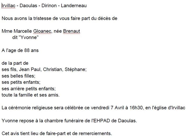 Madame Marcelle Yvonne GLOANEC née BRENAUT