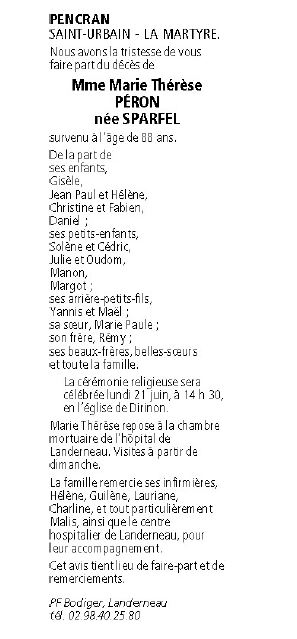 Madame Marie Thérèse PÉRON née SPARFEL