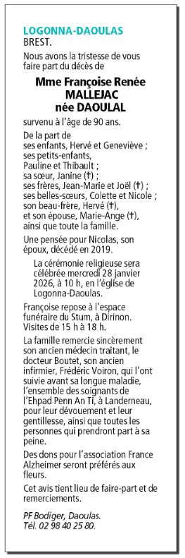 Décédée à Landerneau (29800, France) le samedi 24 janvier 2026 à l'âge de 90 ans