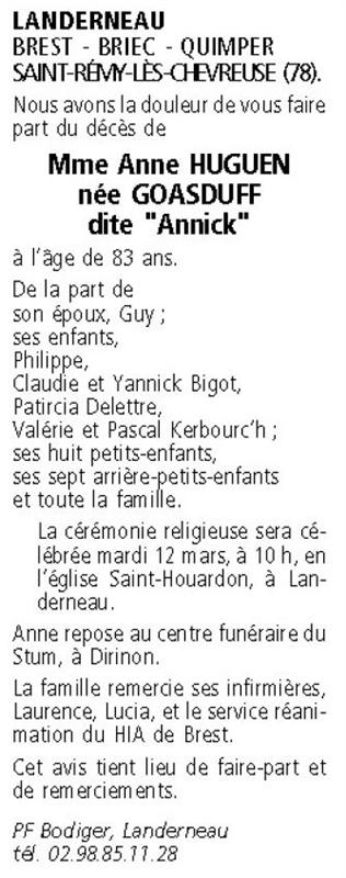 Décédée à Landerneau (29800, France) le vendredi 8 mars 2019 à l'âge de 83 ans