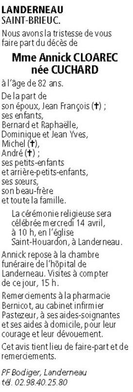 Décédée à Landerneau (29800, France) le dimanche 11 avril 2021 à l'âge de 82 ans