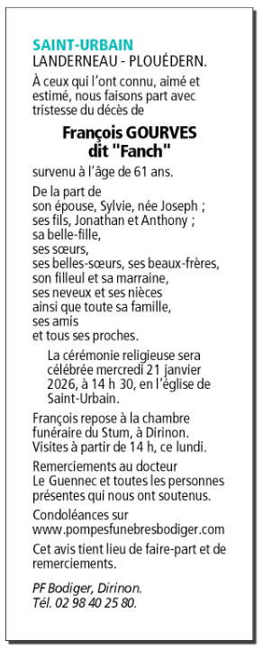 Décédé à Saint-Urbain (29800, France) le mardi 13 janvier 2026 à l'âge de 61 ans