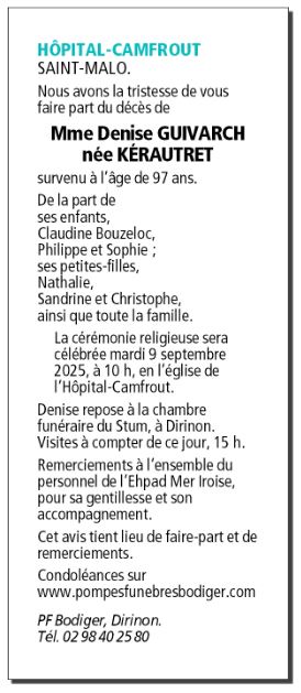 Décédée à Brest (29200, France) le jeudi 4 septembre 2025 à l'âge de 97 ans