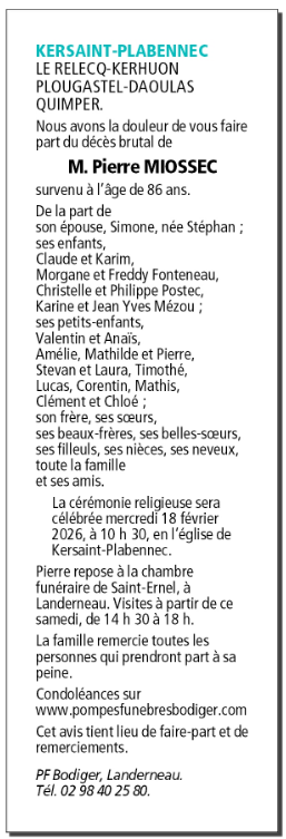 Décédé à Kersaint-Plabennec (29860, France) le jeudi 12 février 2026 à l'âge de 86 ans
