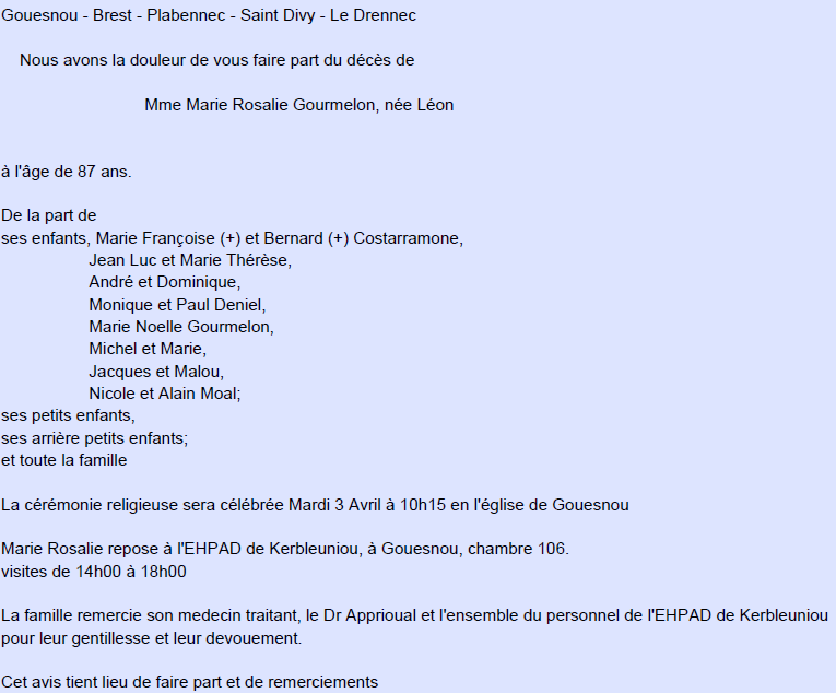 Décédée à Gouesnou (29850, France) le vendredi 30 mars 2018 à l'âge de 87 ans