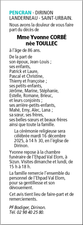 Madame Yvonne CORBÉ née TOULLEC