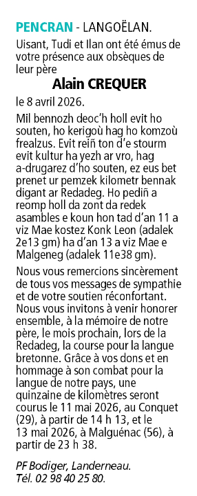 Décédé à Landerneau (29800, France) le jeudi 2 avril 2026 à l'âge de 61 ans