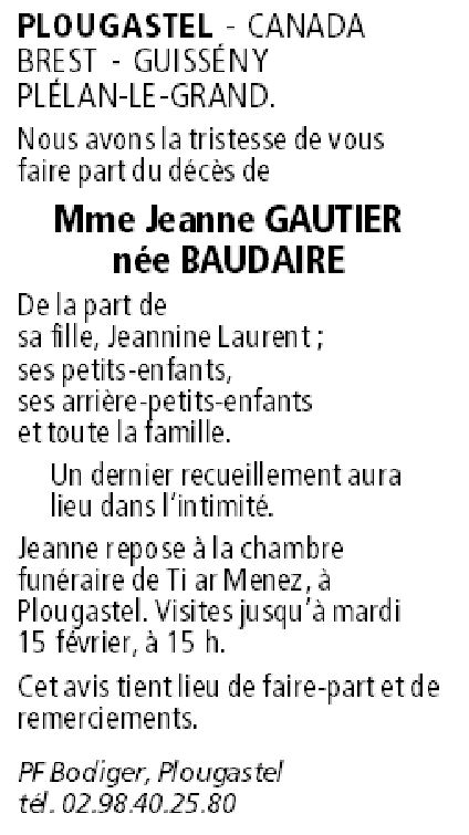 Décédée à Plougastel-Daoulas (29470, France) le samedi 12 février 2022 à l'âge de 101 ans