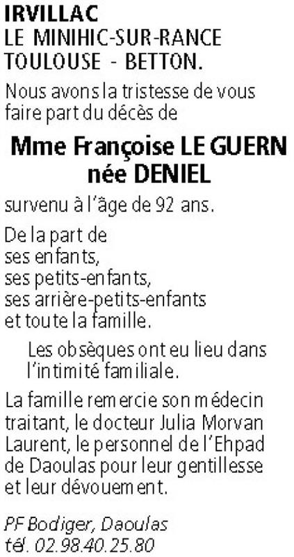 Décédée à Daoulas (29460, France) le dimanche 27 septembre 2020 à l'âge de 94 ans